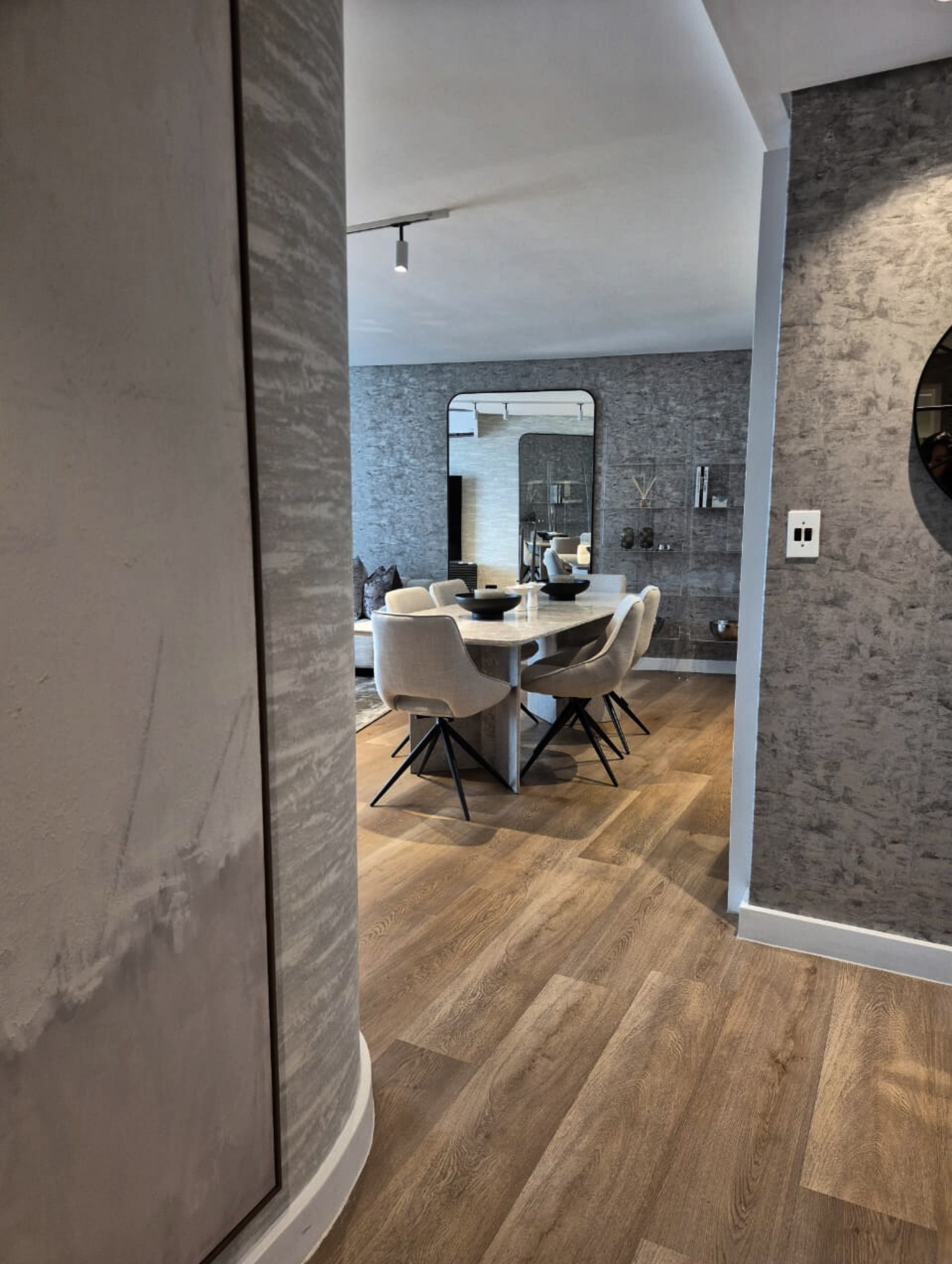 DINE IN STYLE We incorporated large mirrors and a dining table crafted in marble to double as a kitchen island. Sleek elegant chairs that's super comfortable completes this look